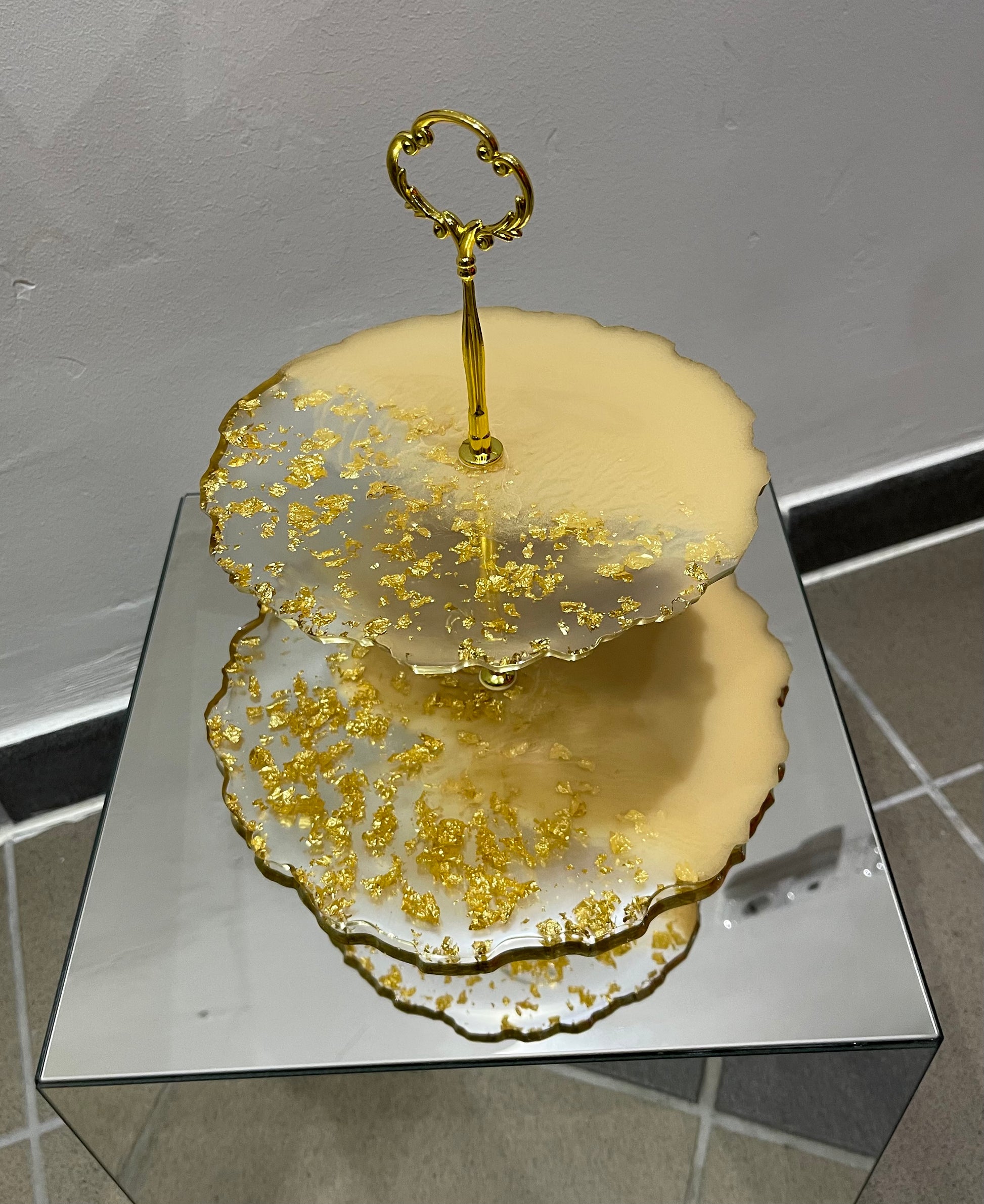 Wunderbar für Schmuck, Kekse, Muffins, Pralinen oder nur als Tischdeko. Die dreistöckige Etagere ist 33cm hoch und die zweistöckige Etagere 27cm hoch.